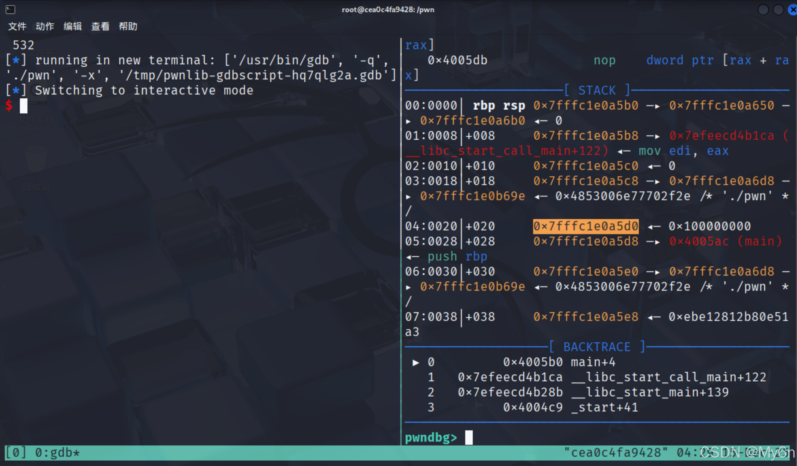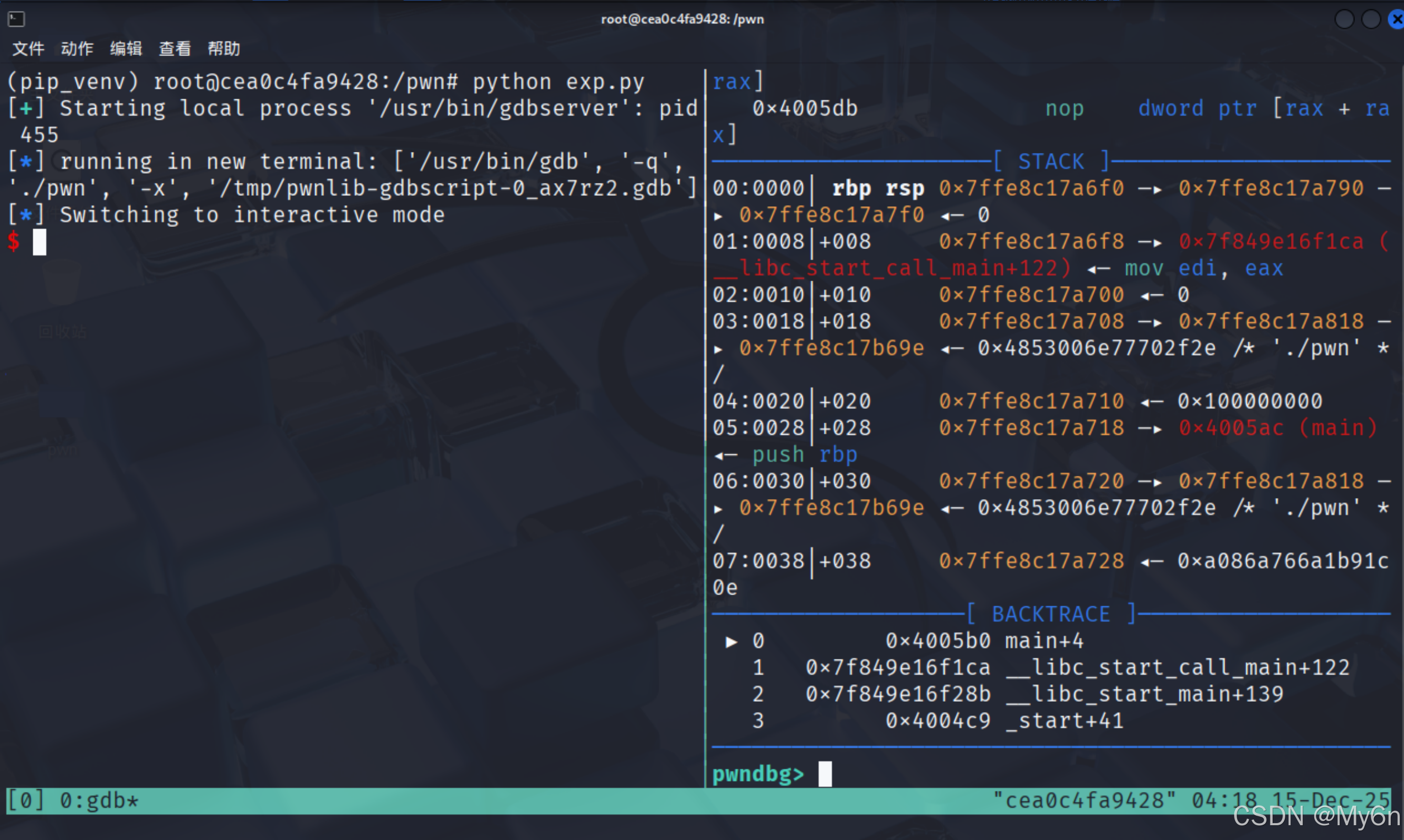 创建新窗口 (New Window) :在当前的 tmux 会话中创建一个新的窗口 来运行 GDB。您需要使用 tmux 快捷键(通常是 Ctrl+b 然后按数字)来切换 GDB 窗口和 Exploit 脚本窗口。 |