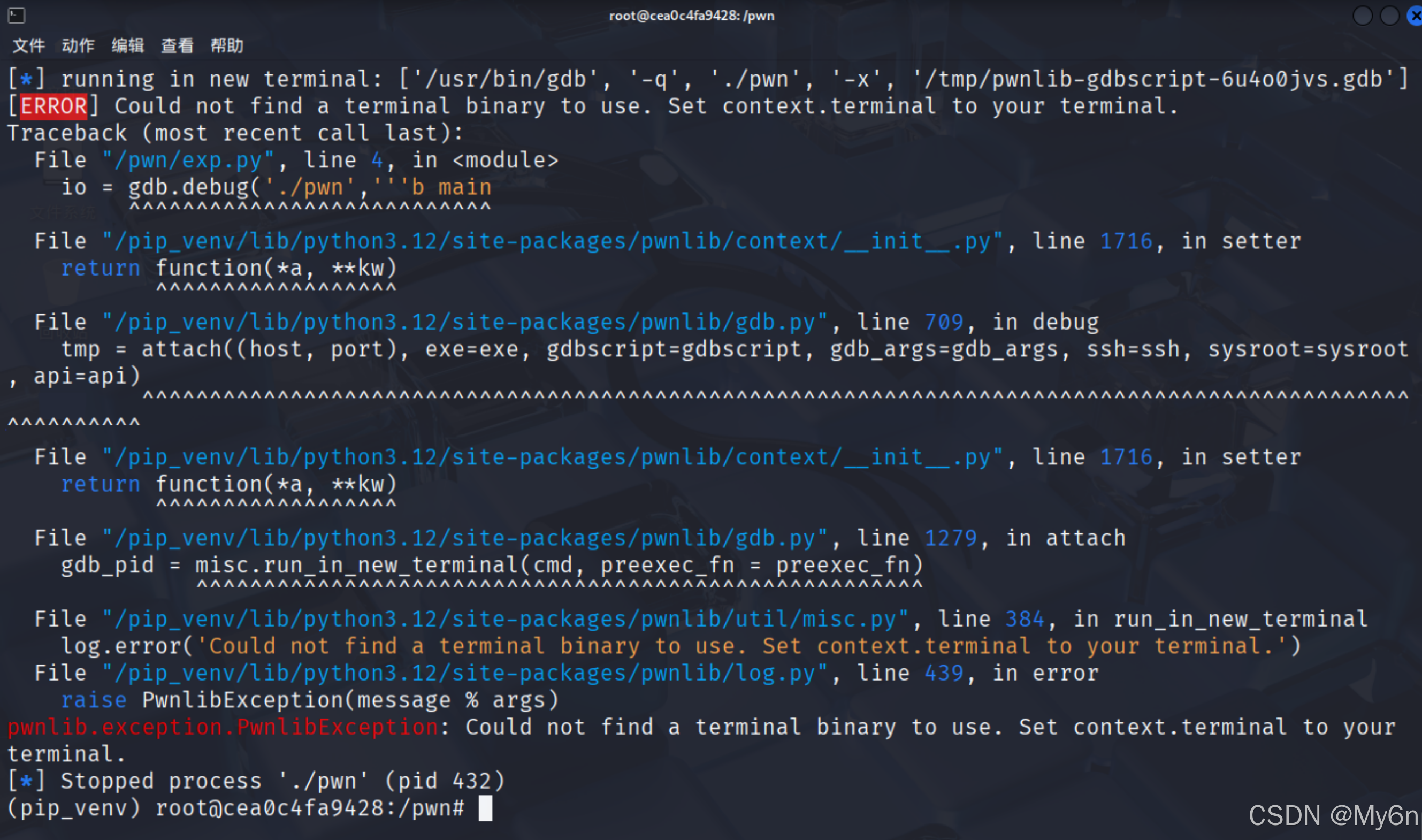 原因在于 pwntools 无法在 Docker 容器默认的终端环境中启动 GDB 所需的"新终端窗口"