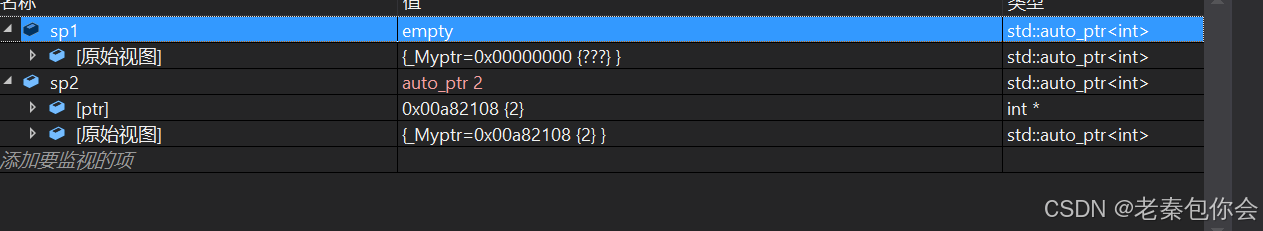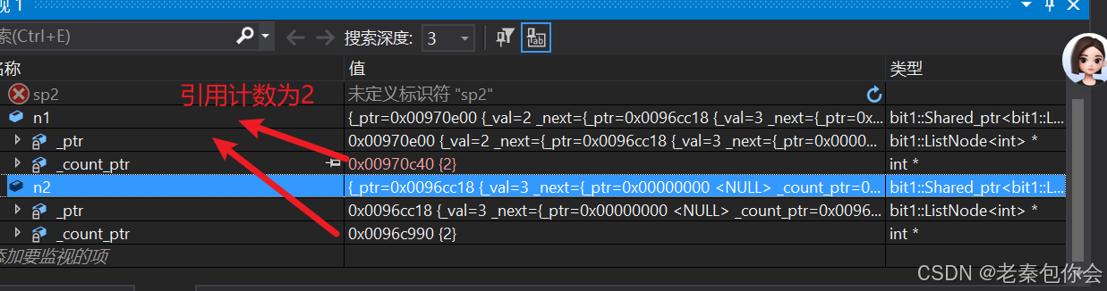 可以看出,这个类里面有一个地址指针成员,当拷贝到第二个智能指针上的时候如下: