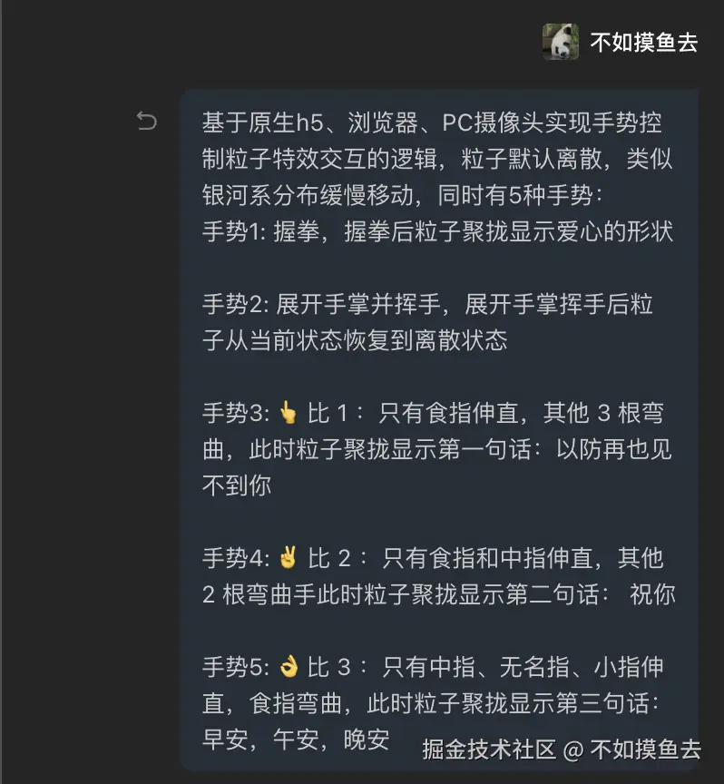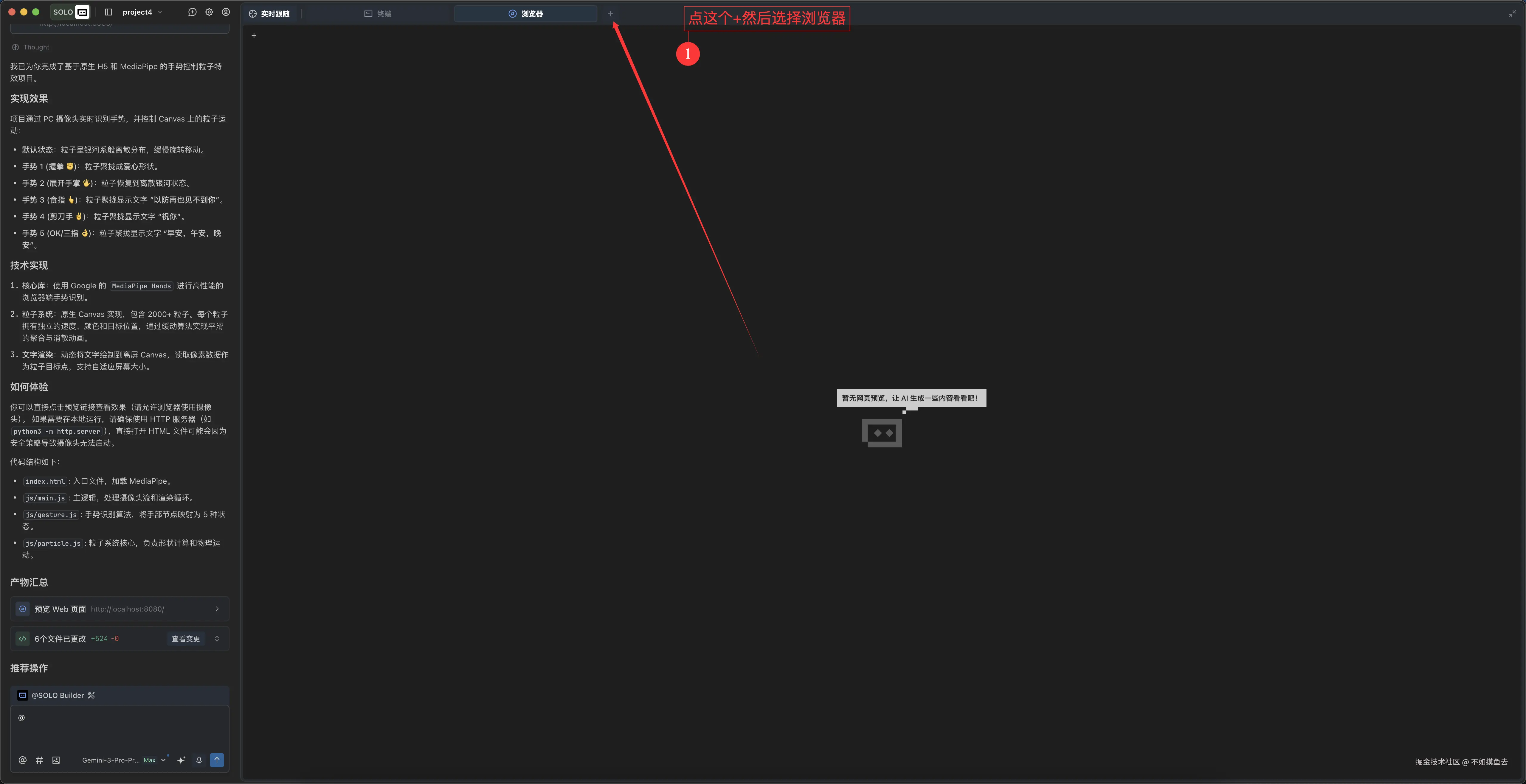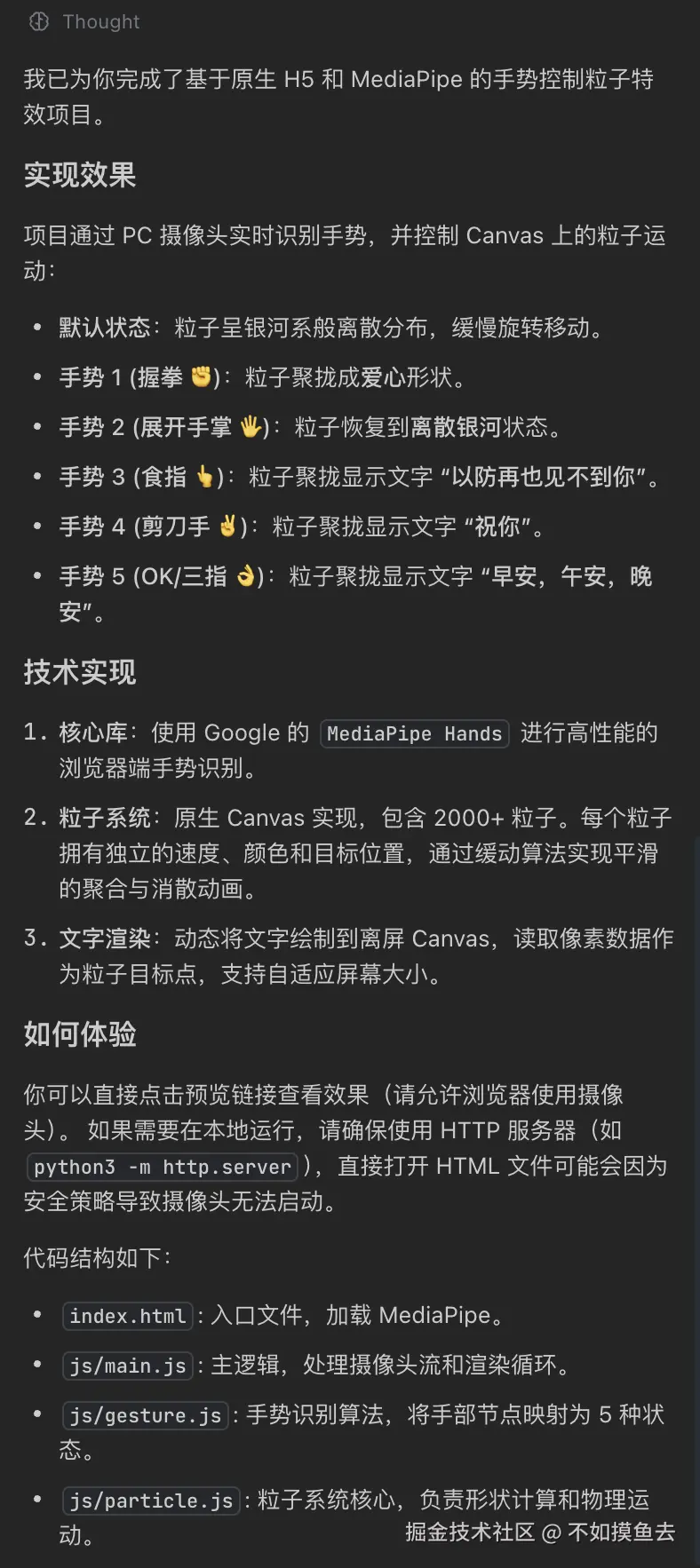 前几天在家养病时刷抖音,刷到了很多用 Gemini 3做粒子交互特效的视频,感觉很不错,TRAE SOLO 正好也集成了 Gemini 3 pro ,今天就分享一下如何用 TRAE SOLO 快速制作一个告白粒子交互特效。