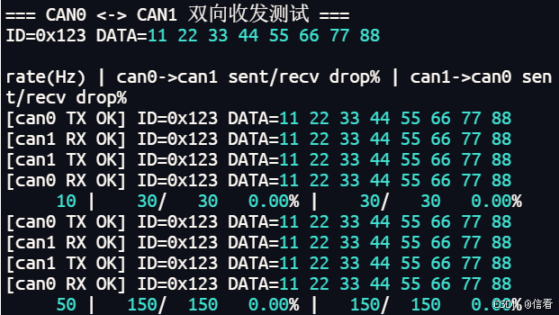 print("\n=== CAN0 <-> CAN1 双向收发测试 ===")
