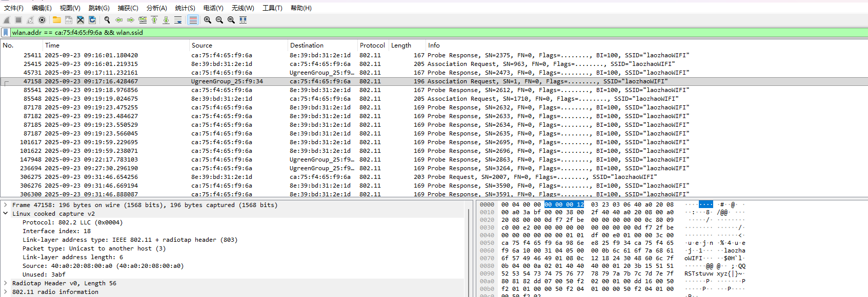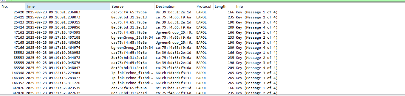 先做了第二题回来看简单多了,得到一个在四次握手中反复出现的mac地址,于是直接进行对这该mac地址过滤