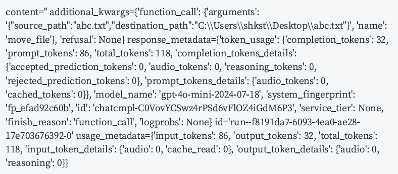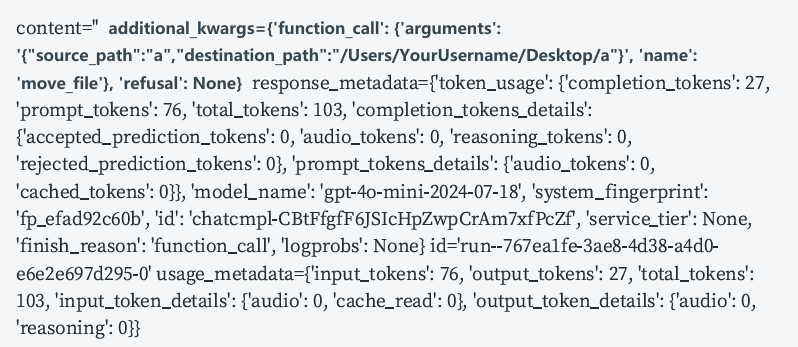 如果模型认为需要调用工具(如 MoveFileTool ),返回的 message 会包含: