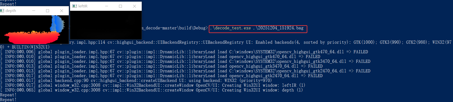 使用Cmake-gui界面,编译完成后,使用VisualStudio软件生成解决方案后,生成对应的.exe文件,之后使用如下命令,即可解析.bag文件。