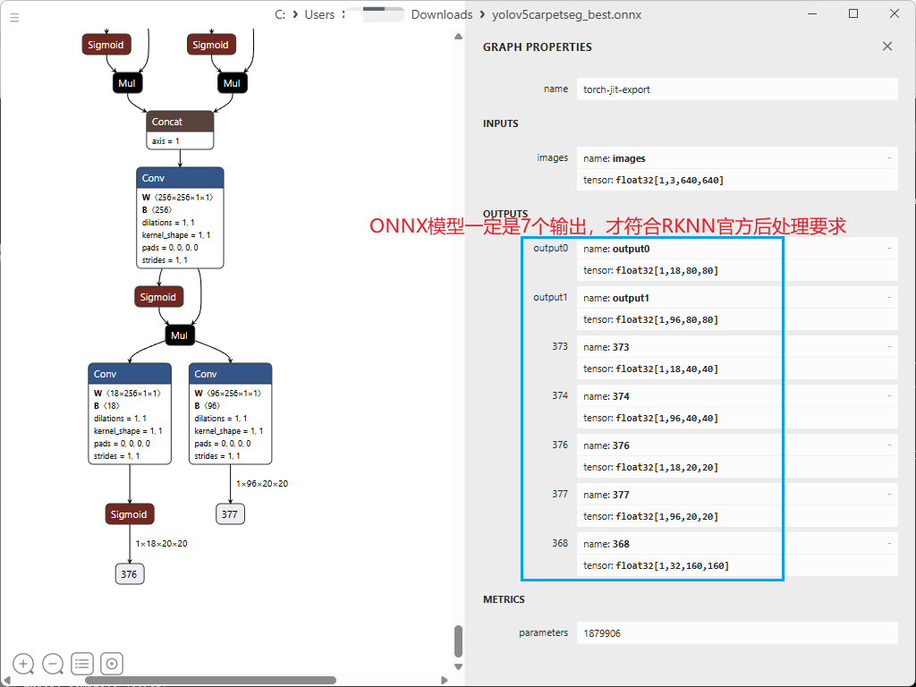 此时需要用netron打开onnx模型,观察模型输出是否正确,应该为如下所示,即有7个输出通道:
