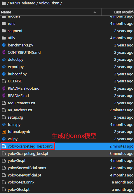 然后将训练好的best.pt模型复制到yolov5-rknn路径下,我将其重命名为yolov5carpetseg_best.pt,然后执行命令: