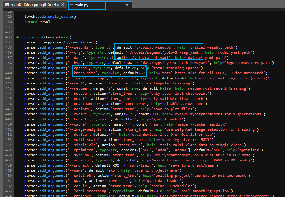 将segment/train.py 下的 def parse_opt(known=False): 中的参数进行修改,包括weights、cfg、data、epochs、batch-size等,如下所示**(注意:一定要使用segment文件夹内部的train.py,不要使用和segment文件夹同级的train.py,前者专门用于分割,后者专门用于检测,功能不一样,选错文件训练时会报错)**: