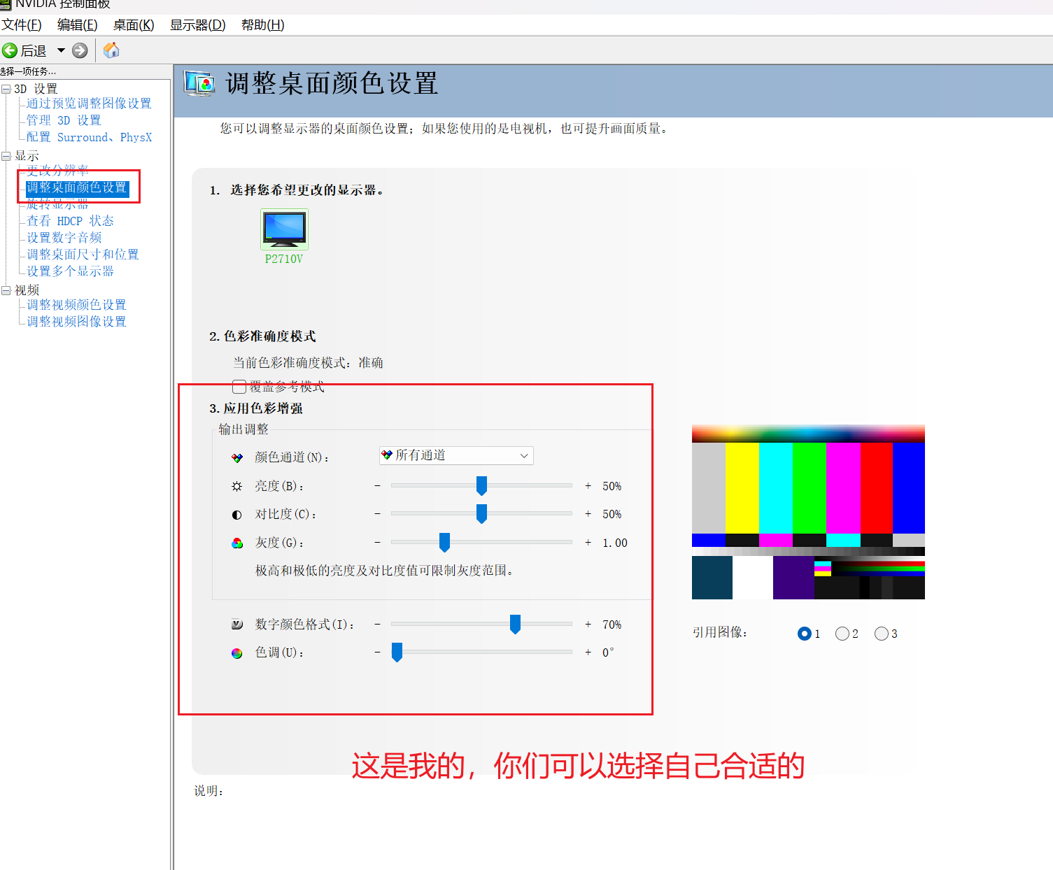 可以进入显示器的菜单键,进行调整颜色和饱和度,当然你们可以根据自己的需求,去调整属于自己的 合适的选项