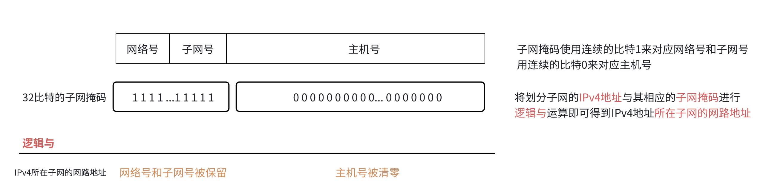 子网掩码:32比特的子网掩码可以表明分类IP地址的主机号部分被借用了几个比特作为子网号
