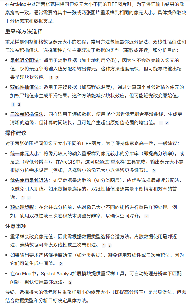 2、ArcMap,两张范围相同,像元大小不同的tif图片,为了保证像素宽高的一致,是把大的像元改为小的像元,还是把小的像元改为大的像元?