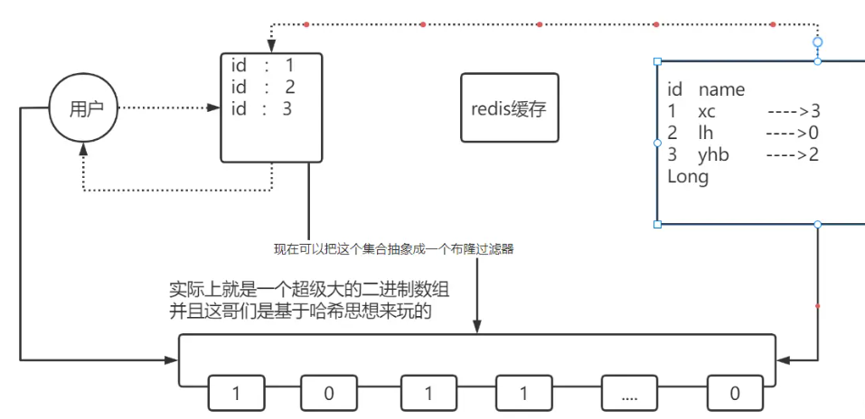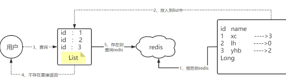 我们可以将数据库的数据,所对应的id写入到一个list集合中 ,当用户过来访问的时候 ,我们直接去判断list中是否包含当前的要查询的数据,如果说用户要查询的id数据并不在list集合中,则直接返回,如果list中包含对应查询的id数据,则说明不是一次缓存穿透数据 ,则直接放行。