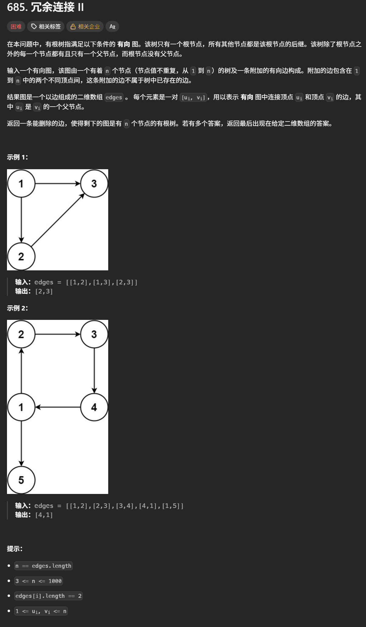 (2)题目要求:有一个有向图,是由一棵有向树 + 一条有向边组成的(所以此时这个图就不能称之为有向树),现在要求找到这条有向边并将其删除,使得这个图可以恢复为有向树。