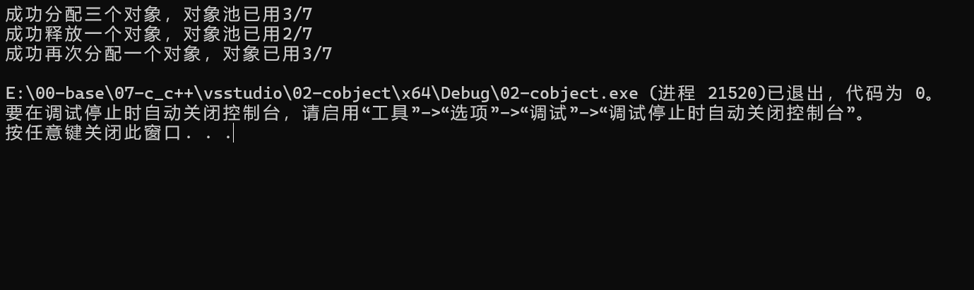 printf("成功分配三个对象,对象池已用%d/7\n", p->pool_count);