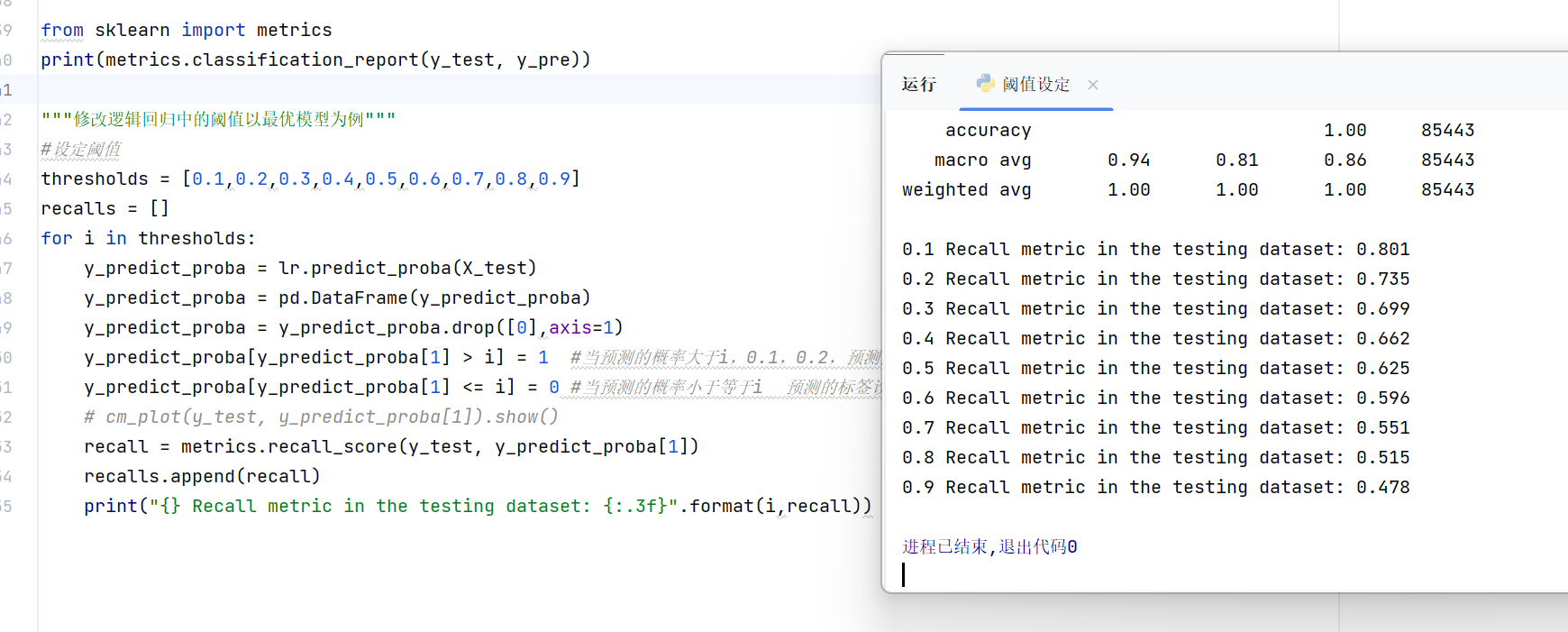 y_predict_proba[y_predict_proba[1] <= i] = 0 #当预测的概率小于等于i 预测的标签设置为0