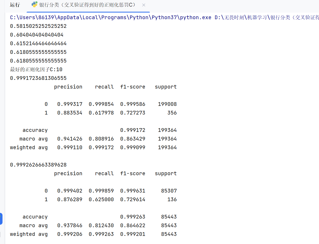 下面附上完整的项目代码,其实仅仅是中间加入了for循环,使用价差验证的方法获取最优的正则化因子C。