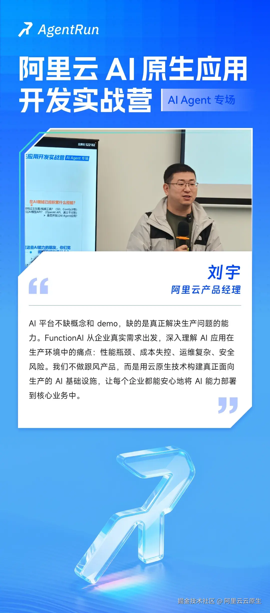 阿里云智能集团产品专家刘宇为大家讲解:聚焦云原生时代 AI 基础设施的深度变革,剖析传统 AI 应用面临的开发门槛高、运维复杂、生态割裂等核心挑战。通过 FunctionAI,展示新一代云原生 AI 基础设施如何重新定义 AI 应用体验。探讨如何通过云原生技术栈构建开箱即用的 AI 基础设施,快速进行高可用的 AI Agent 构建,让开发者更专注 AI 业务创新,实现开源共建生态,让每个人都能享受 AI 时代的技术红利。