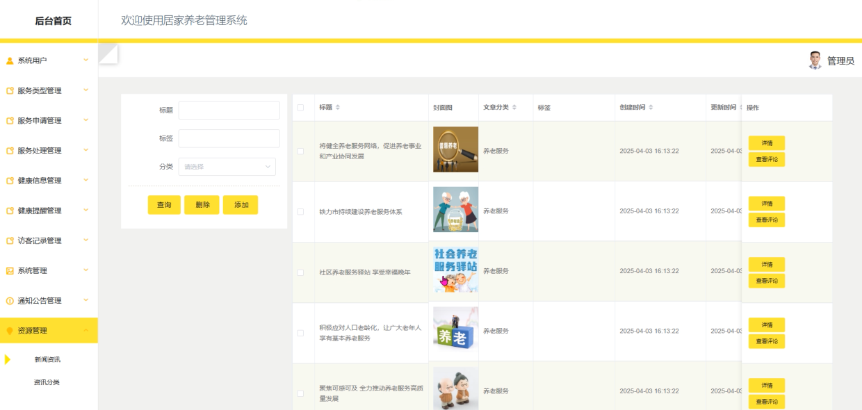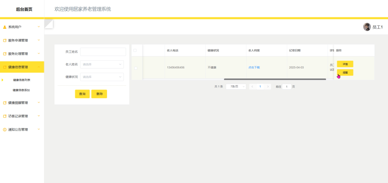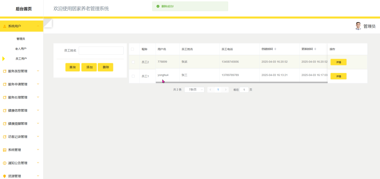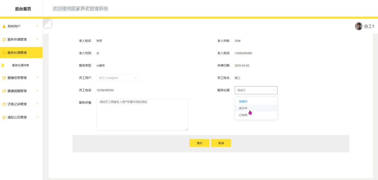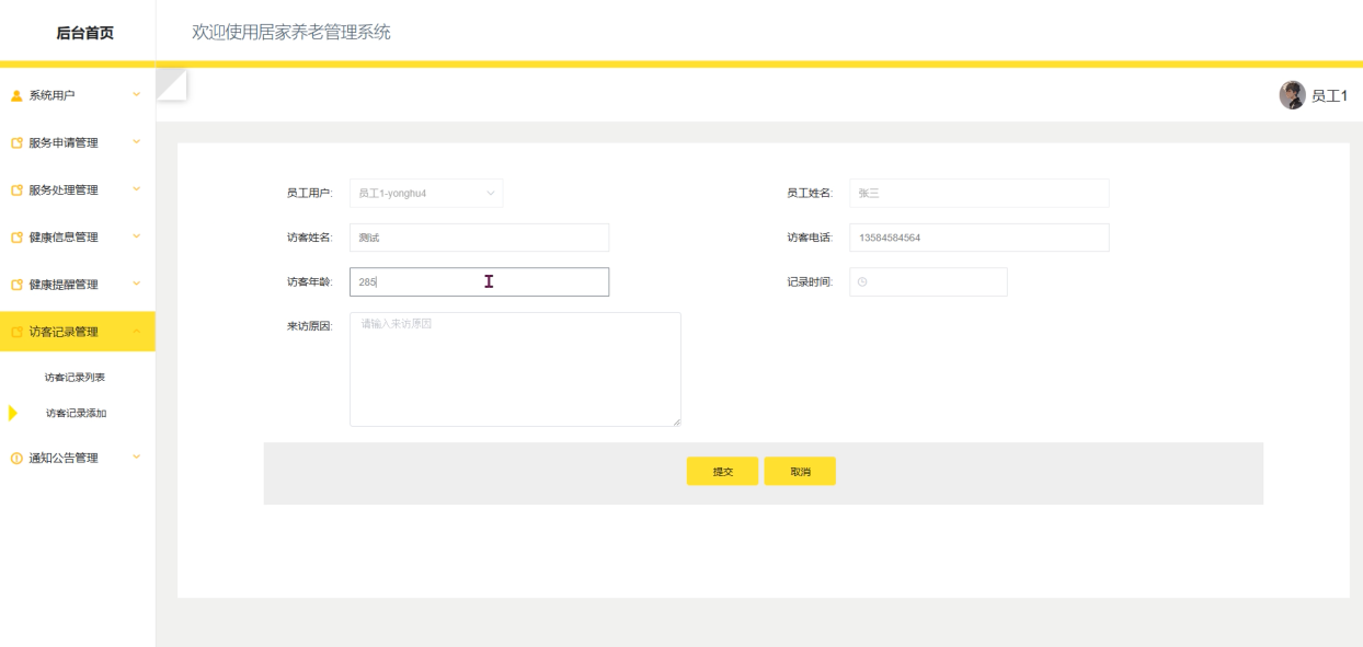 With the intensification of the aging society, the demand for home-based elderly care services is growing rapidly. However, the traditional home-based elderly care model faces problems such as scattered resources, inconvenient management and low efficiency. Based on the Spring Boot framework and MySQL database, the system is designed for home care services, and realizes the separation of functions of elderly users, employee users and administrators. Elderly users can access the homepage, notices, news, etc., and can submit service applications and manage personal health information; Employee users are responsible for the review and processing of service applications and health management. The administrator manages the system comprehensively, including user management, service type management, resource management, etc. The system adopts a front-end and back-end separation design, and the front-end display is implemented using modern technology to ensure the user experience. By providing a convenient service application process, personalized health management and efficient information management, it not only improves service quality, but also enhances management efficiency. This platform enables the elderly to enjoy more intimate home care services, and at the same time allows managers to more easily maintain system resources, so as to improve the overall service efficiency and user experience of home care.
