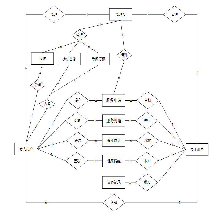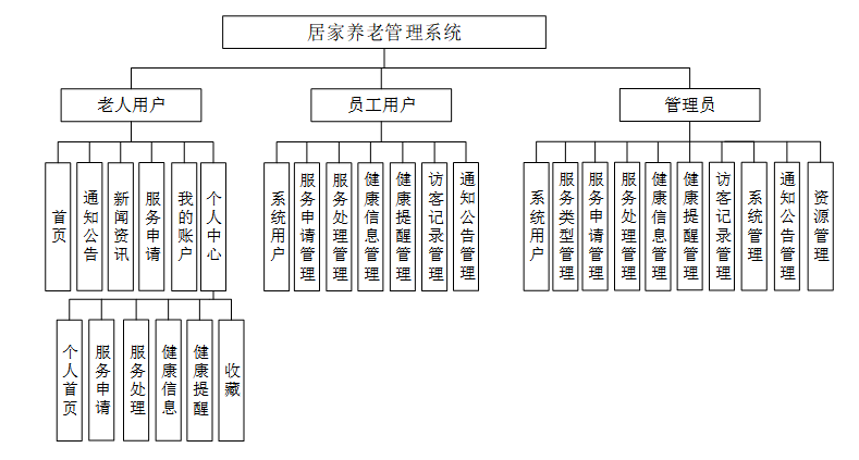 本居家养老管理系统旨在通过信息化手段提升老年人的生活质量和养老服务的效率。系统主要分为三个角色:老人用户、员工用户和管理员,每个角色都拥有特定的功能模块来满足其需求,包括但不限于服务申请、健康管理、信息公告和个人账户管理等。具体功能描述如下: