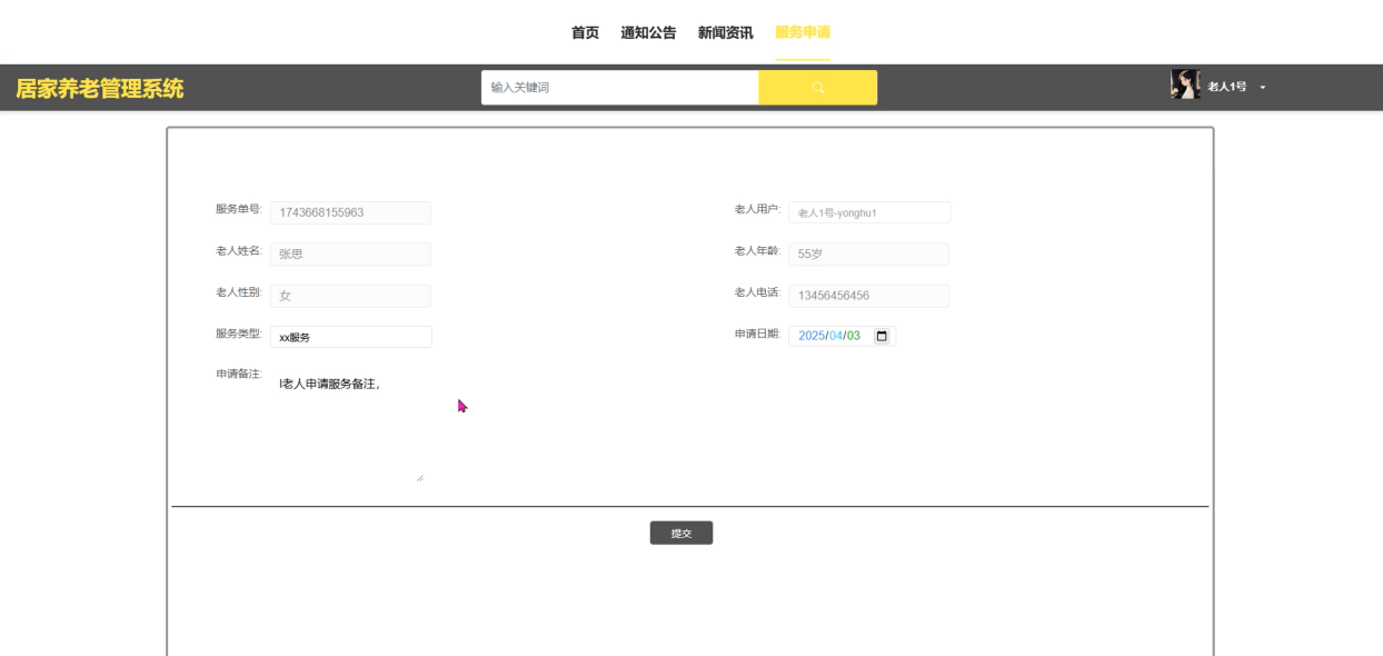 服务申请:提交服务请求,如医疗预约、家政服务等,并可查看申请状态。