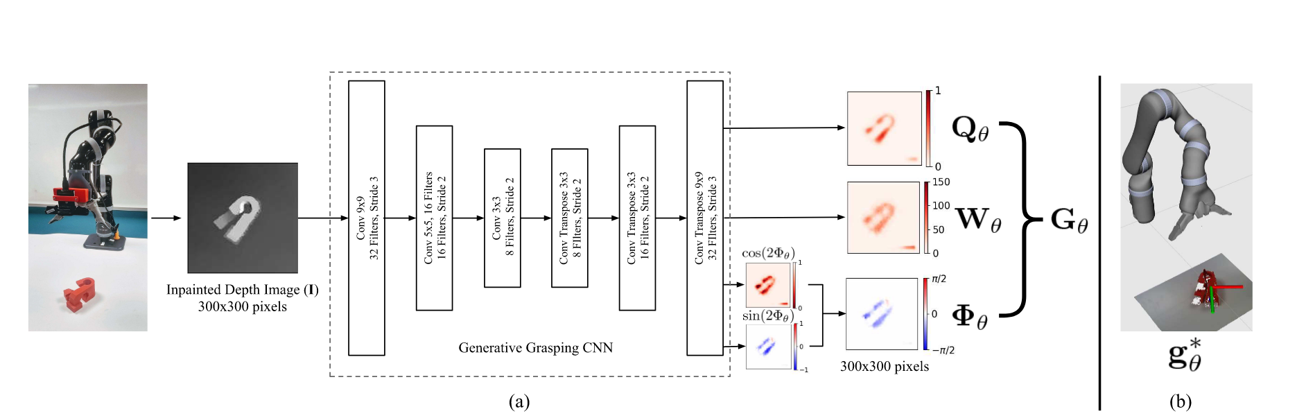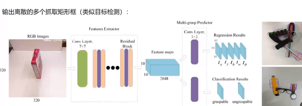 - 第三步:用神经网络评估 "好不好抓":把每个候选的抓取姿势对应的图像块,都放进一个叫 "Grasp Quality CNN" 的神经网络里,让网络输出这个姿势 "能成功抓住的概率(置信度)"。