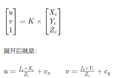 如果相机坐标系里有一个物体点,坐标是(X_c, Y_c, Z_c)(Zc 是物体离相机的距离,即深度),那么它在照片里对应的像素坐标(u, v),就是通过内参矩阵计算的: