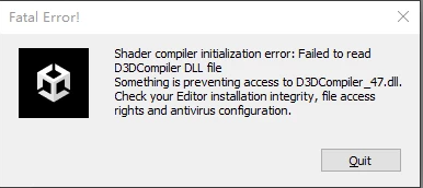 解决方案:之前遇到过这种情况,我遇到的是新版本的引擎安装完毕,打开时就出现这个弹窗。 解决方法很简单,去你电脑上其他版本的unity引擎安装位置,去搜索这个D3DCompiler_47.dll,复制,然后粘贴到你现在版本引擎的对应文件夹位置。