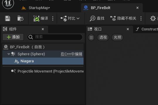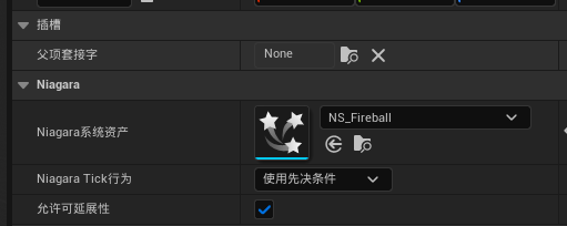 (6) 在根节点(碰撞体)下面添加一个Niagara组件,用于播放粒子特效