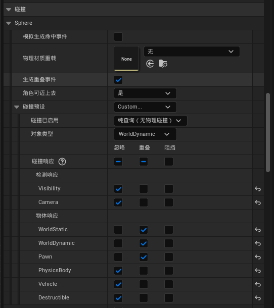 Sphere->SetCollisionResponseToChannel(ECC_WorldDynamic, ECR_Overlap); //设置其与世界动态物体产生重叠事件