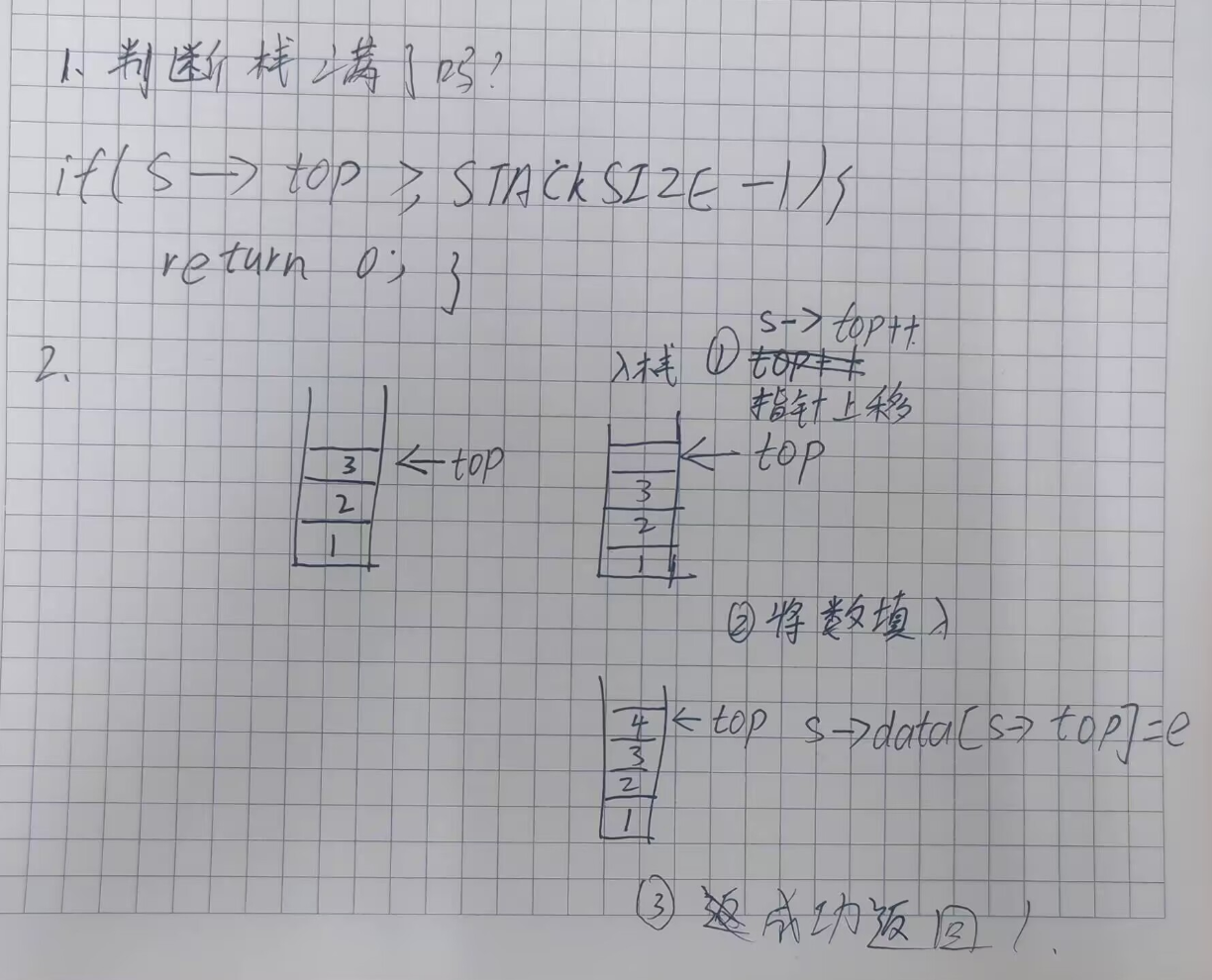 // 进栈:将元素e压入栈,成功返回1,栈满返回0