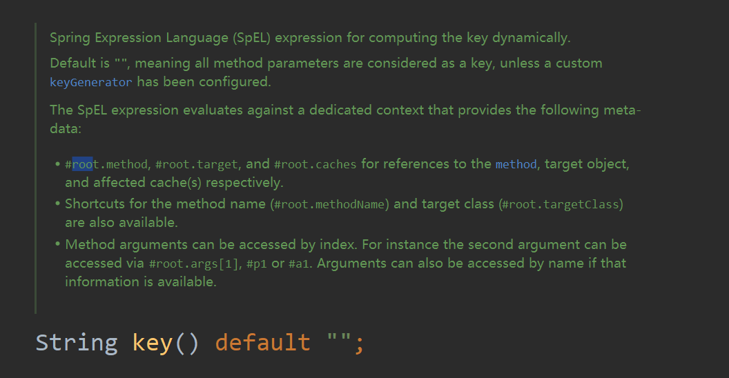 key可以用多种情况展示,参数名称,当有多个参数的时候可以使用#p0,#p1,单一参数的时候可以使用#root,参数名称等多种情况。