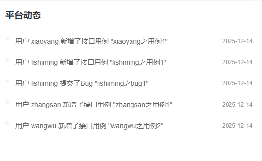 无缝滚动显示最近发生的平台事件,涵盖用户注册、用例新增、Bug提交等关键动作,增强团队透明度和协作感: