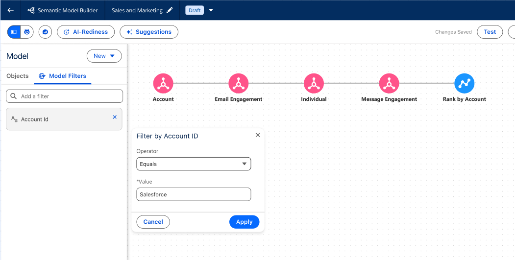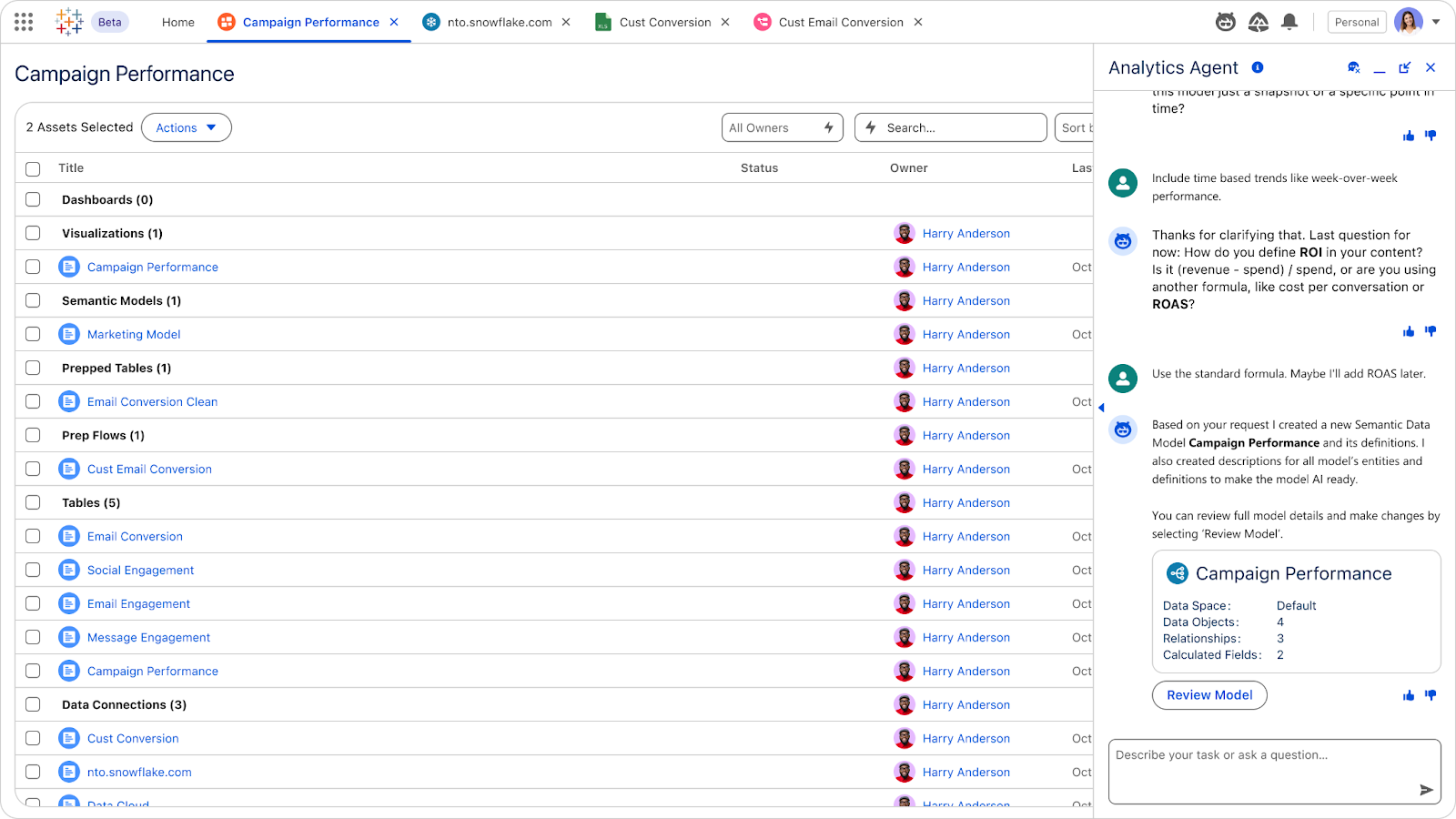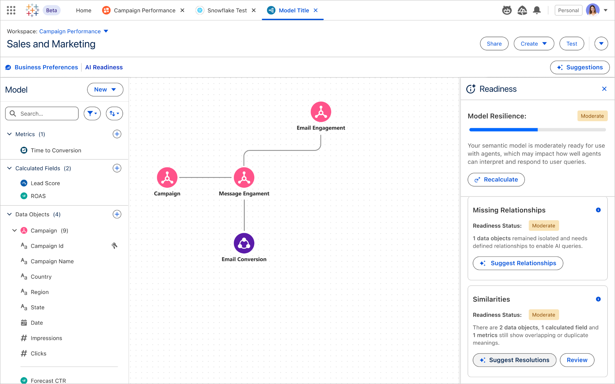 可根据业务目标自动生成一套量身定制的 Semantic Data Model,其中包含相关对象、关系以及计算字段。这样不仅能加速语义模型的创建过程,也能让模型更好地做好面向 AI 的准备。