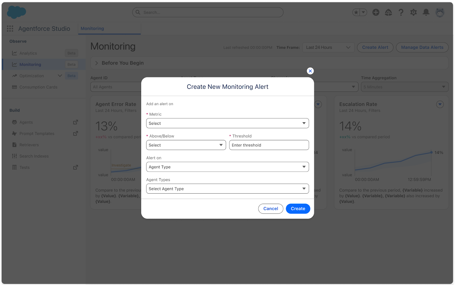 通过主动的数据警报,实时掌握已部署的 AI Agent 的性能状态与可信信号。你可以设置警报并接收通知,从而提前发现潜在的 Agent 问题,及时进行处理。