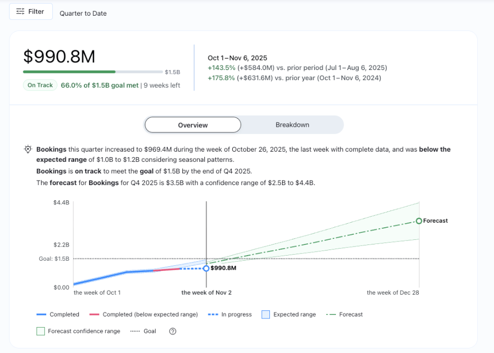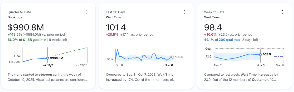 在图表层面,用户可看到书面的进度摘要与对应的解释性图表,并以颜色区分节奏状态。借助这一额外洞察,业务用户能更好地安排优先级,并更快速地做出更明智的决策。