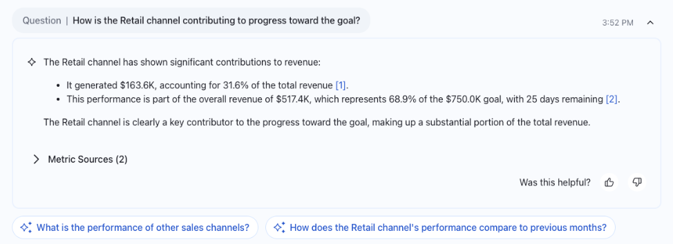 除了从单个指标中获得节奏进度方面的背景信息外,业务用户现在还可以提出问题,并获得结合这些洞察的回答。