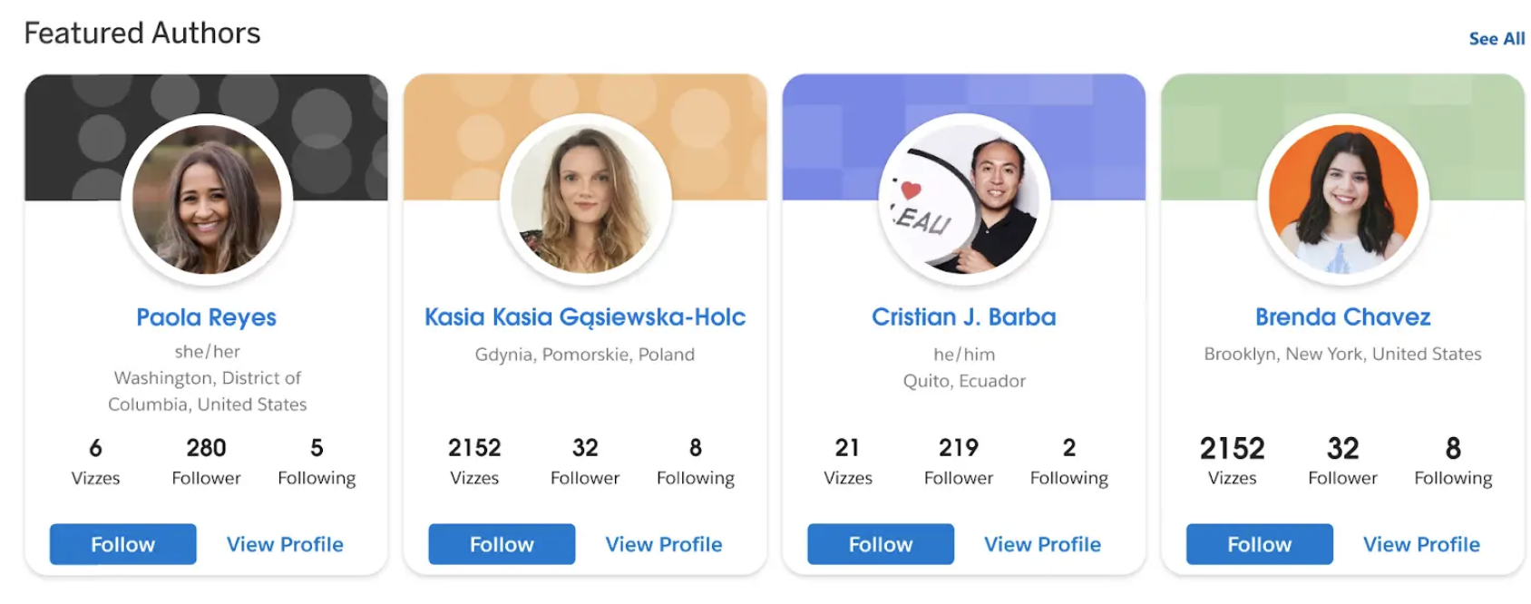 在 Tableau Public 网站的主页上查找 Tableau 社区的创作者。查找并关注有才华的作者,以便通过新鲜有趣的内容来激发灵感。