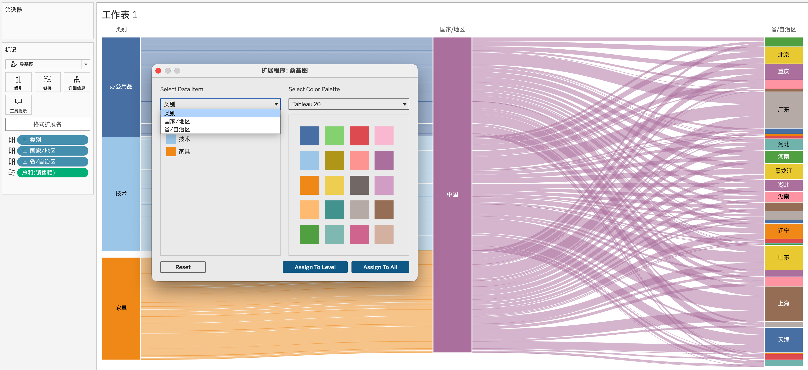 通过这项新体验,创作者能够构建和修改可以在整个工作簿,甚至多个不同工作簿中重复使用的调色板。自定义调色板会保存到首选项文件中,并在后续 Tableau Desktop 会话中保留。