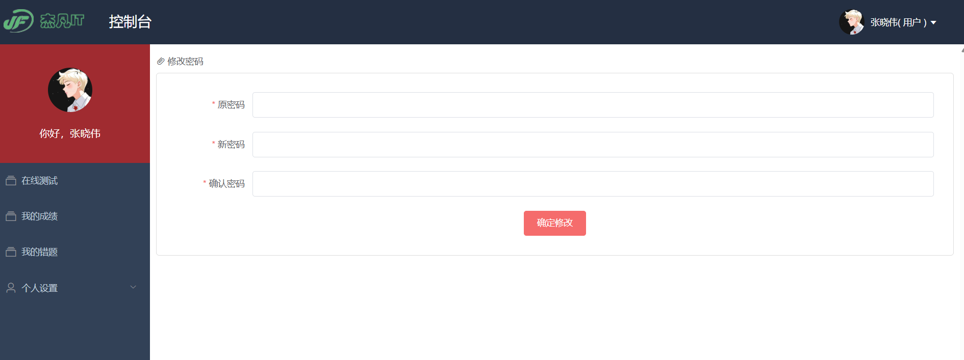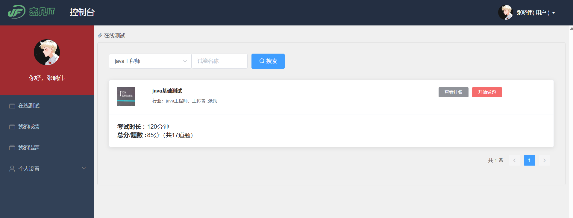 - 在线考试:参加已发布的考试,在规定时间内完成答题并提交试卷。