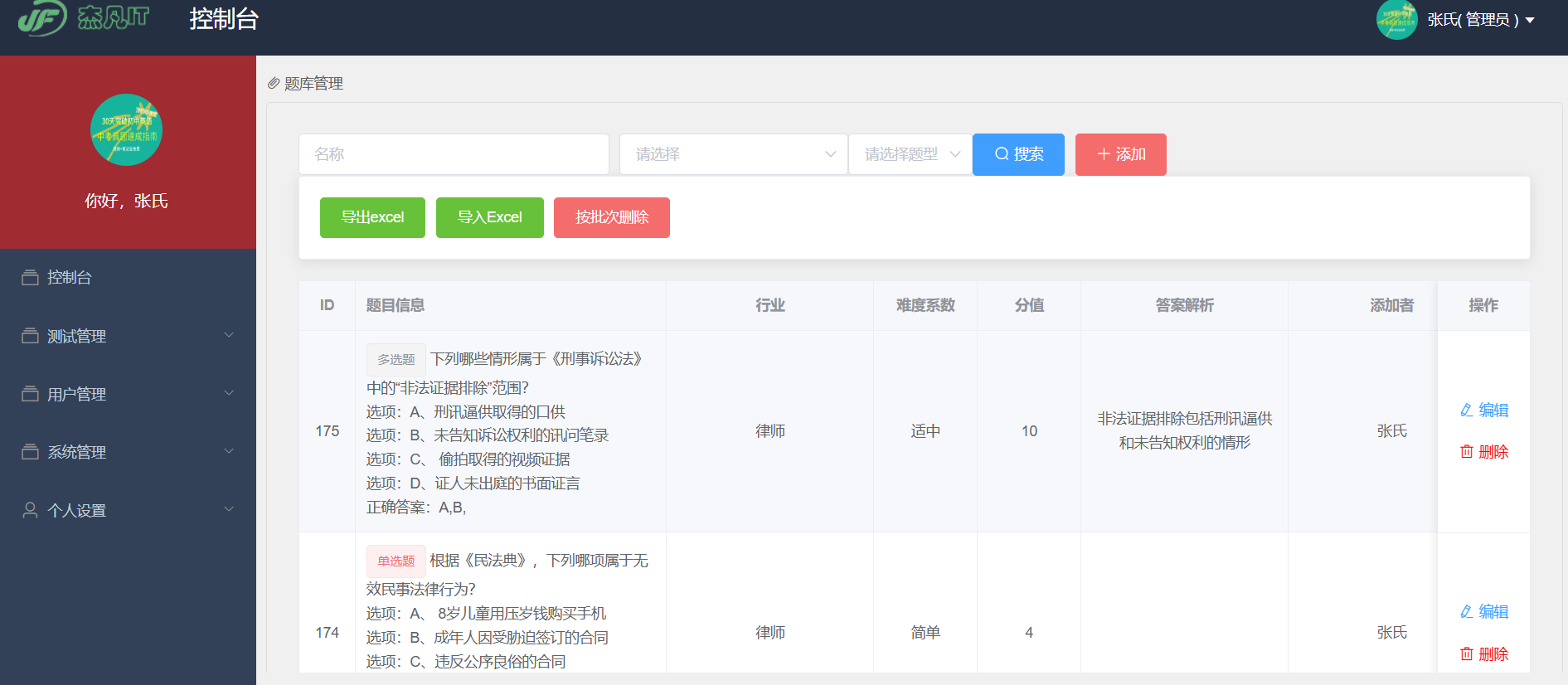 - 题库管理:添加、编辑、删除考试题目,设置题目类型(判断、单选、多选)、难度、分数和解析,支持批量导入题目。
