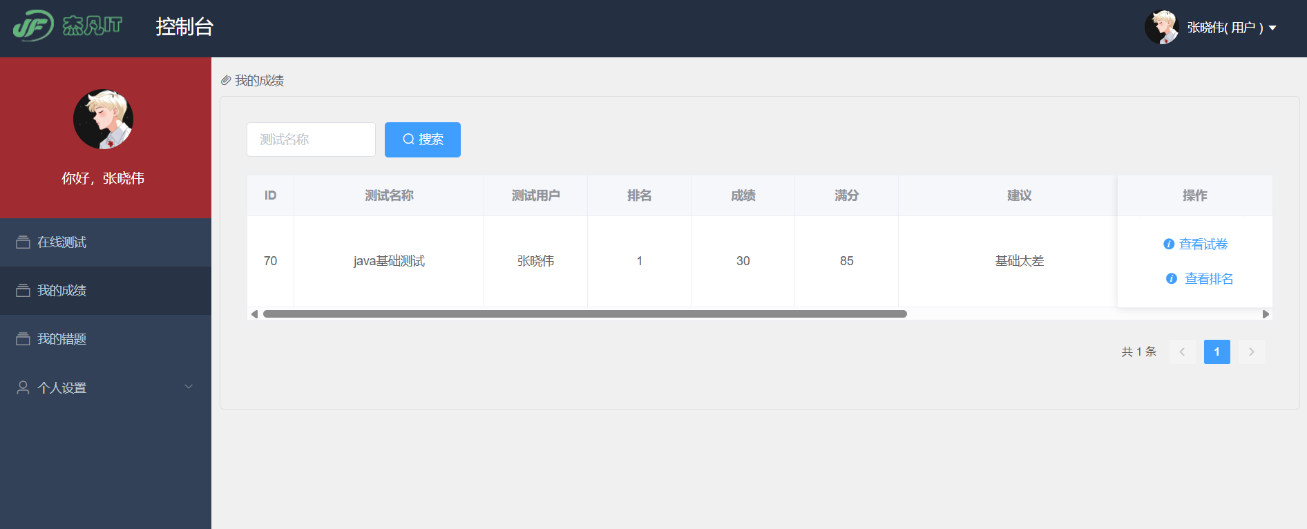 - 成绩查询:查询个人历史考试成绩、排名和试卷详情。