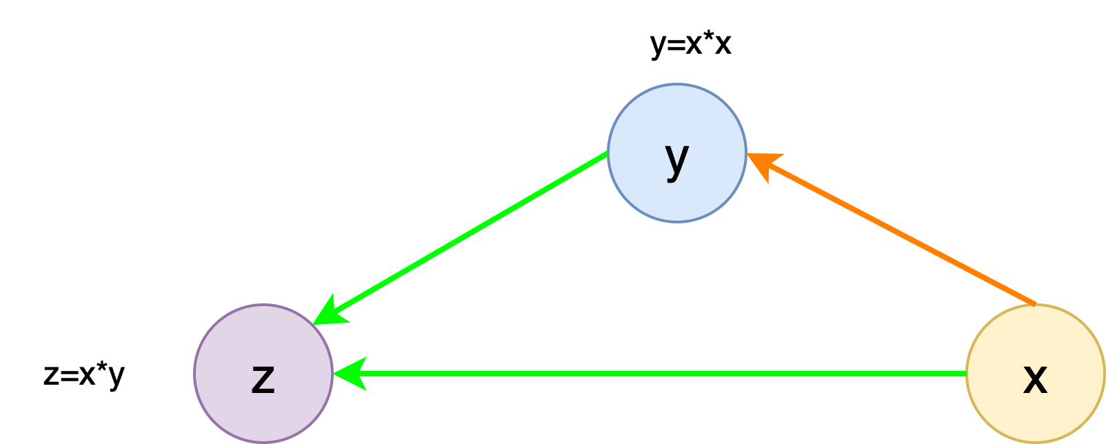 设:y=x2,z=x⋅yy = x^2, z=x \cdot yy=x2,z=x⋅y。如果按照完整的计算图进行反向传播,则有: