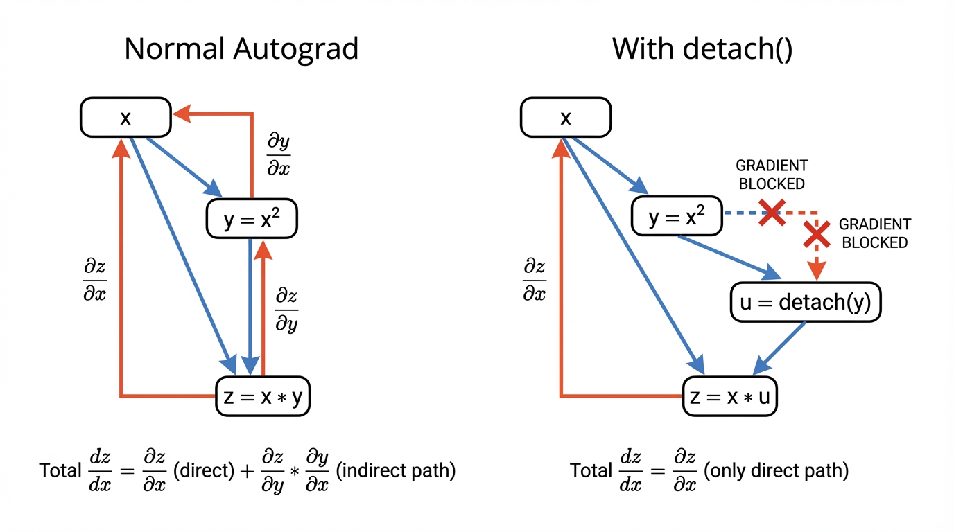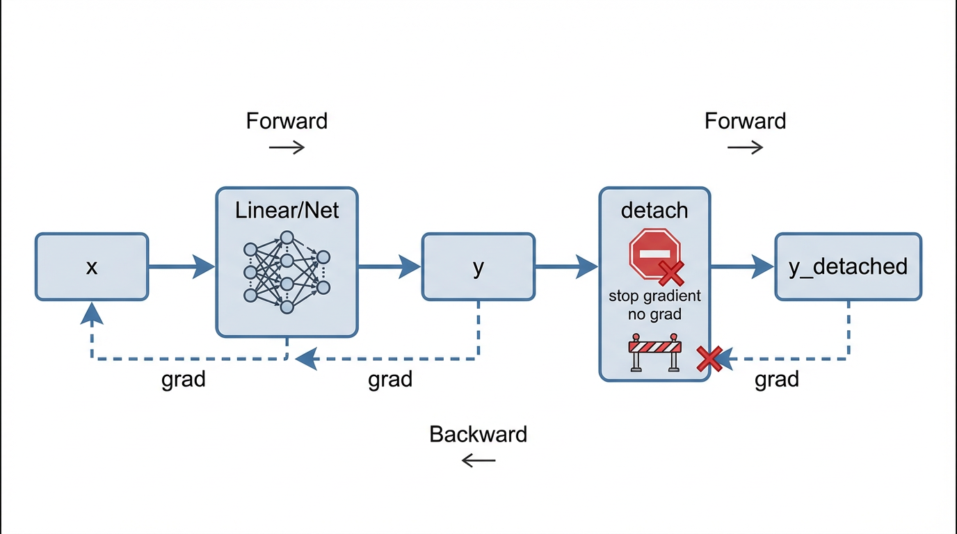 detach() 并不是"关闭梯度计算",而是在计算图中人为切断某些梯度路径。它允许我们在保持数值一致的前提下,精确控制哪些计算参与反向传播、哪些被视为常数。