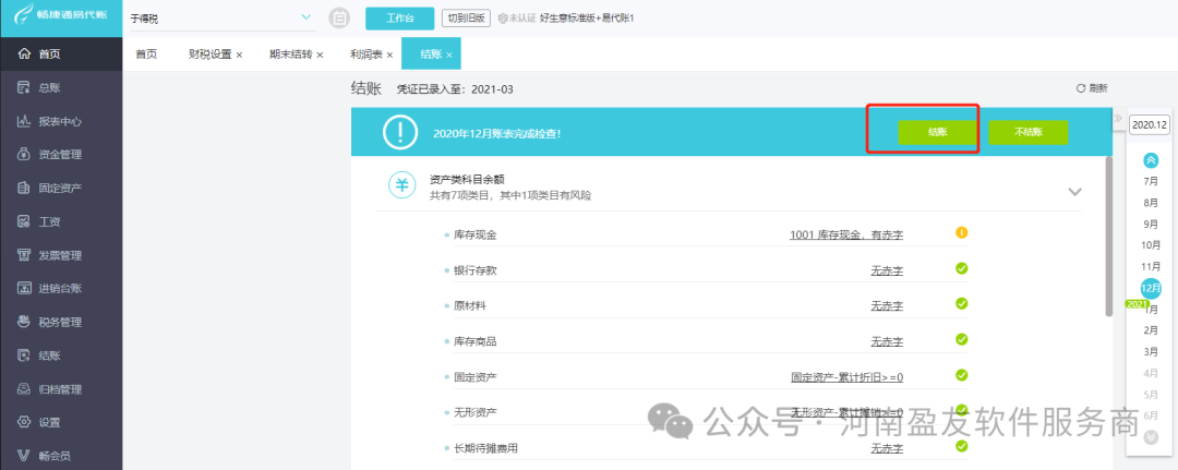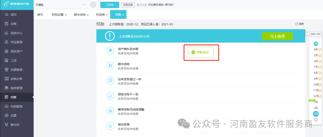 - 结账:当本月所有相关凭证制作完成,点击 设置→结账→马上检查→结账;