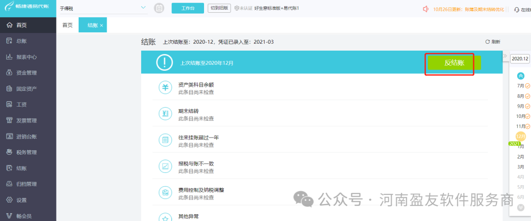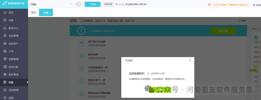 (1)点击【结账】-【结账】,选择需反结账的月份,点击【反结账】;