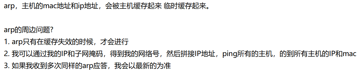 - 每台主机都维护一个ARP缓存表,可以用`arp -a`命令查看。缓存表中的表项有过期时间(一般为20分钟),如果20分钟内没有再次使用某个表项,则该表项失效,下次还要发ARP请求来获得目的主机的硬件地址。