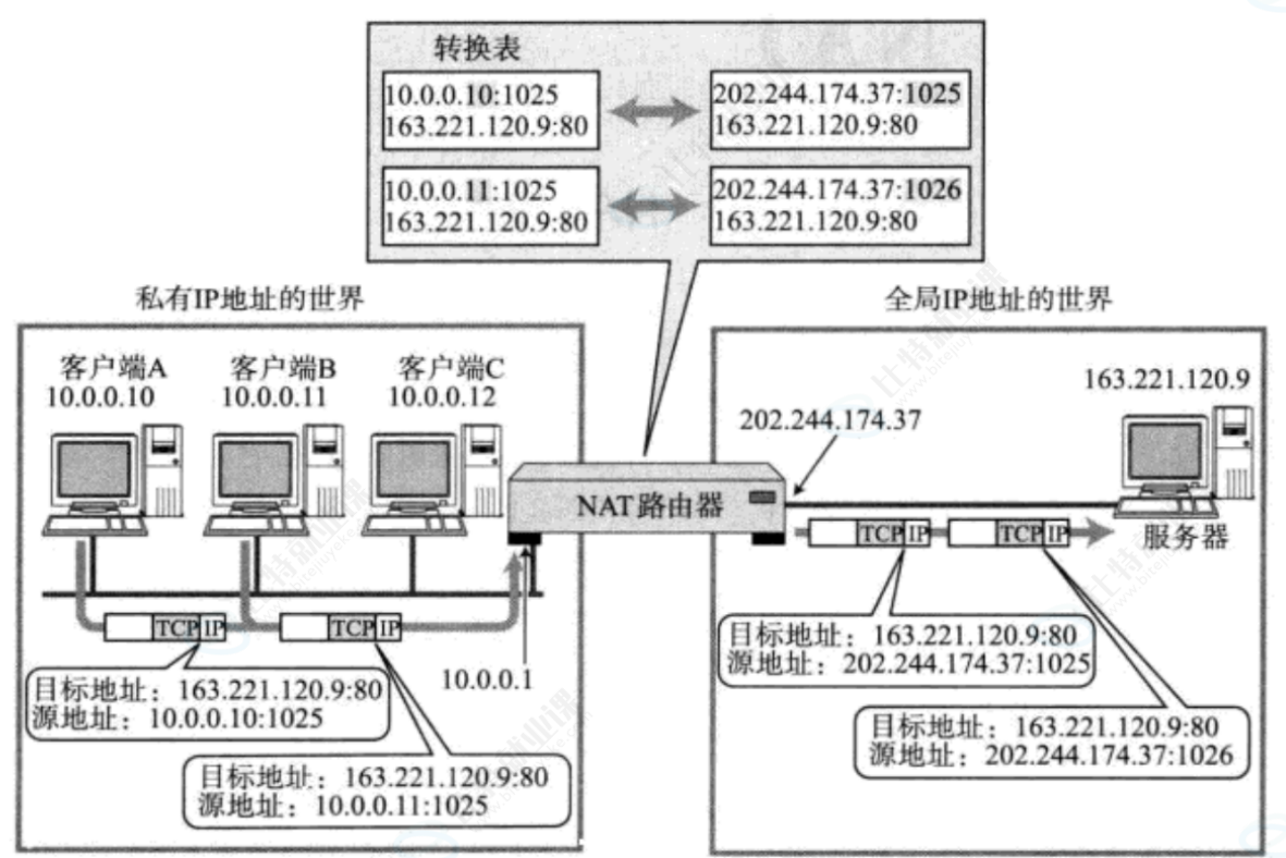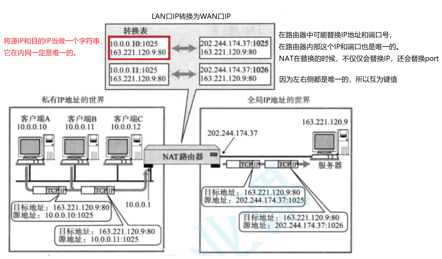 这种关联关系也是由NAT路由器自动维护的。例如在TCP的情况下,建立连接时,就会生成这个表项;在断开连接后,就会删除这个表项。