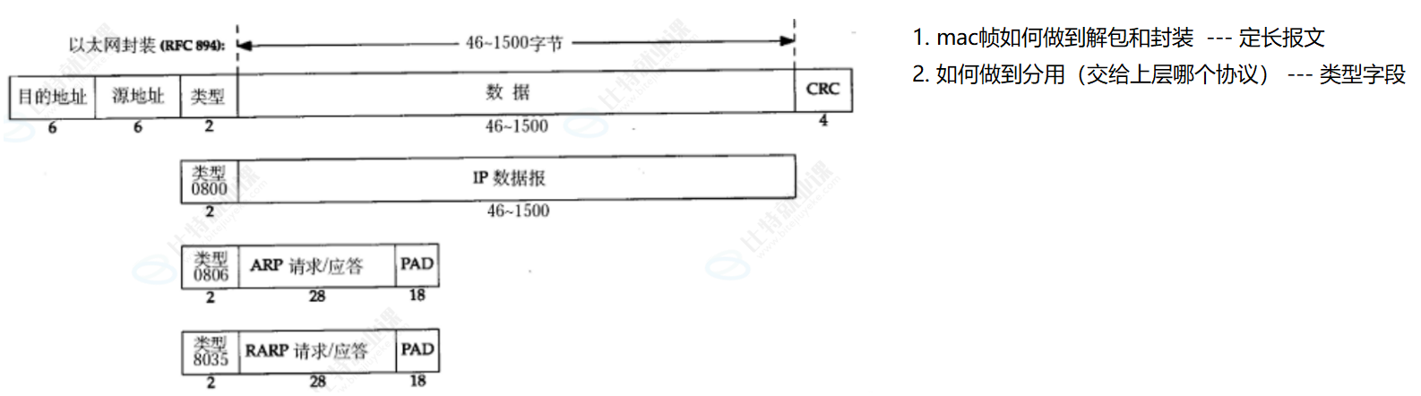 - 帧协议类型字段有三种值,分别对应IP、ARP、RARP;