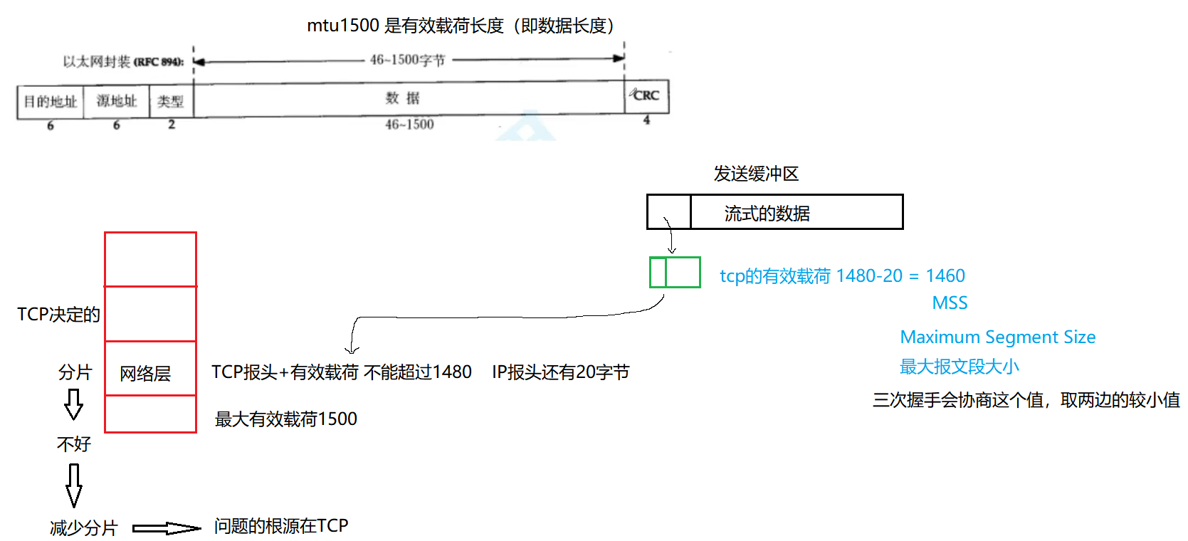 - TCP的一个数据报也不能无限大,还是受制于MTU。TCP的单个数据报的最大消息长度,称为MSS(Max Segment Size);