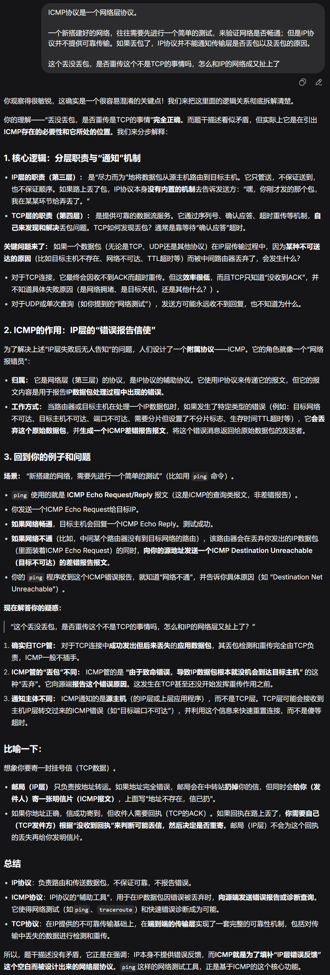 - 一旦这些小包中任意一个小包丢失,接收端的重组就会失败。但是IP层不会负责重新传输数据;
