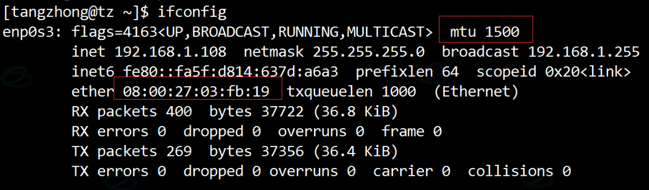 使用ifconfig命令, 即可查看ip地址, mac地址, 和MTU;